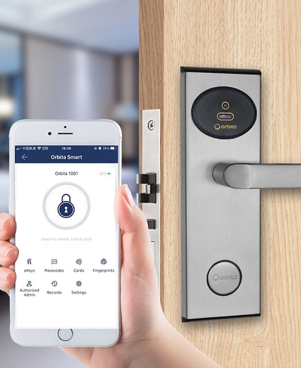 ORBITA E3010S Hotel Lock made of grade 304 stainless steel with a PVC card reader cover, with strong resistance to impact, corrosion and abrasion.